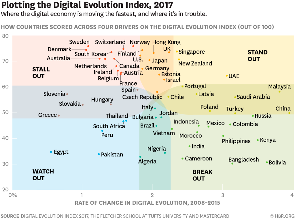 As part of a collaboration between the Fletcher School at Tufts University and Mastercard, we created the Digital Evolution Index and analyzed the state and rate of digital evolution across 60 countries. This evolution is the outcome of an interplay among four drivers, with about 170 indicators across them.
